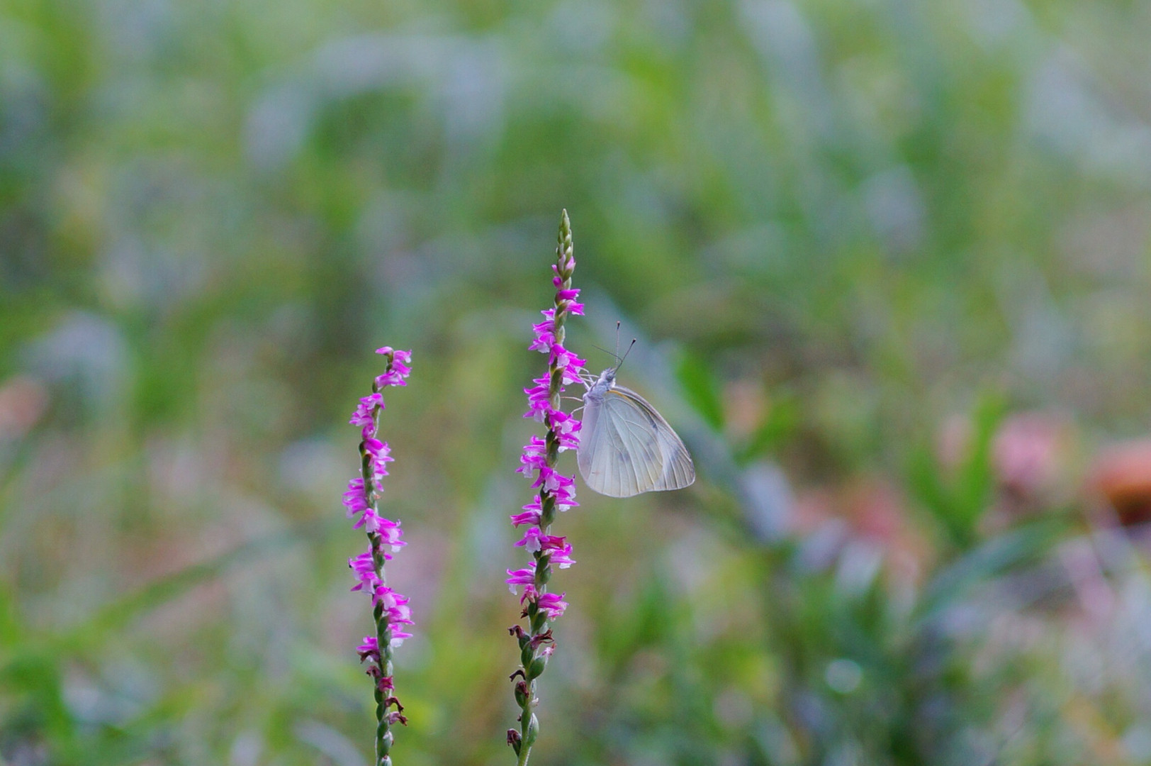 好きなネジバナにモンシロチョウが吸蜜にきてました。気に入ったようで何回も飛びながらきてたので連写で撮りました(^^)