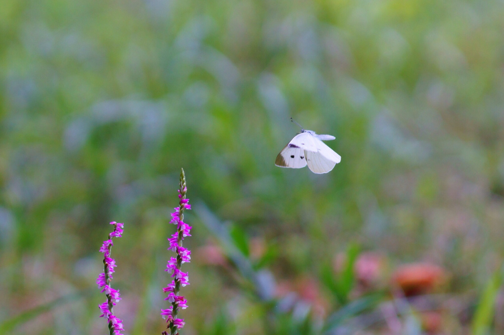 好きなネジバナにモンシロチョウが吸蜜にきてました。気に入ったようで何回も飛びながらきてたので連写で撮りました(^^)