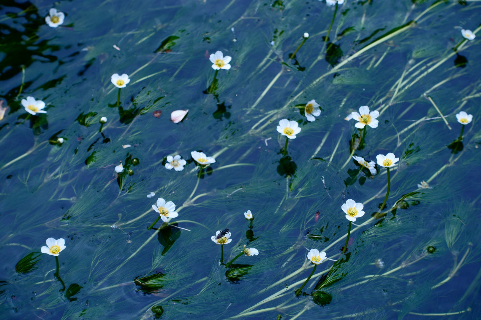 きれいな川に咲く小さな花、梅花藻。よく見ると虫が止まっている。