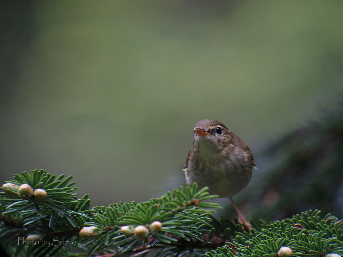 亜高山帯の針葉樹森でチョリチョリチョリ…と爽やかな囀りを奏でるメボソムシクイ 見上げることの多い鳥だけど、やっとコメツガの花とのコラボが撮れました