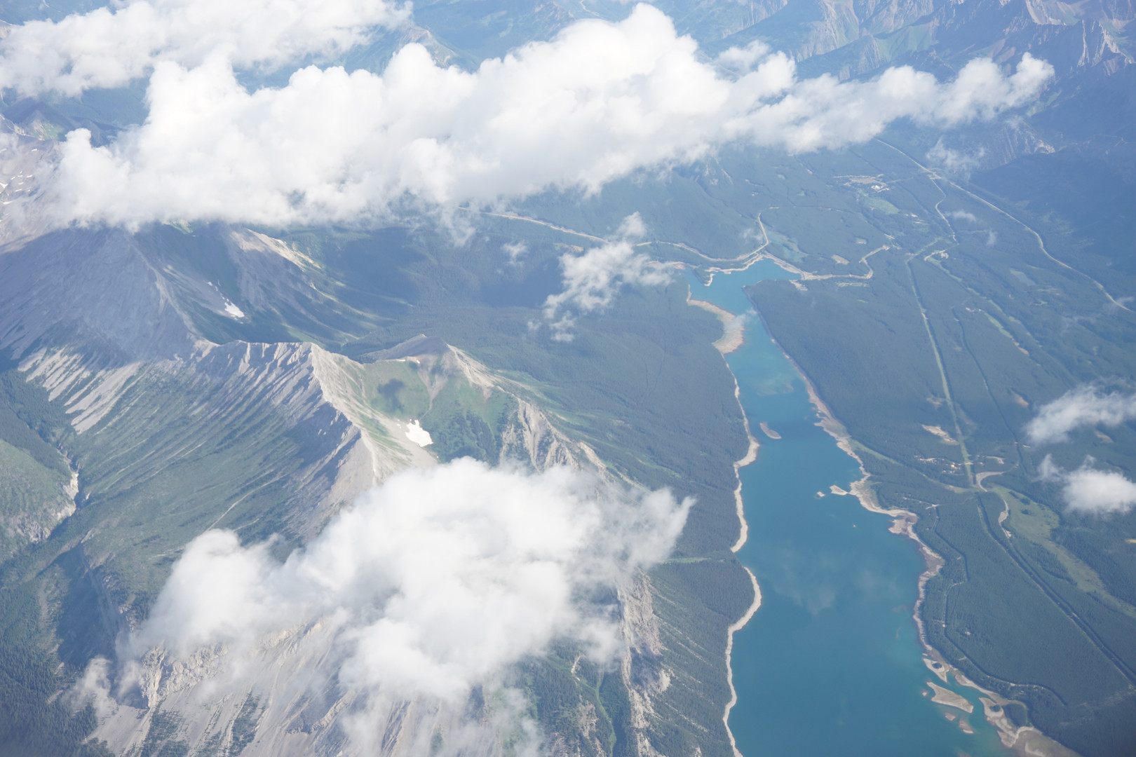 機内から カナディアンロッキーと美しき湖が見えてきました。