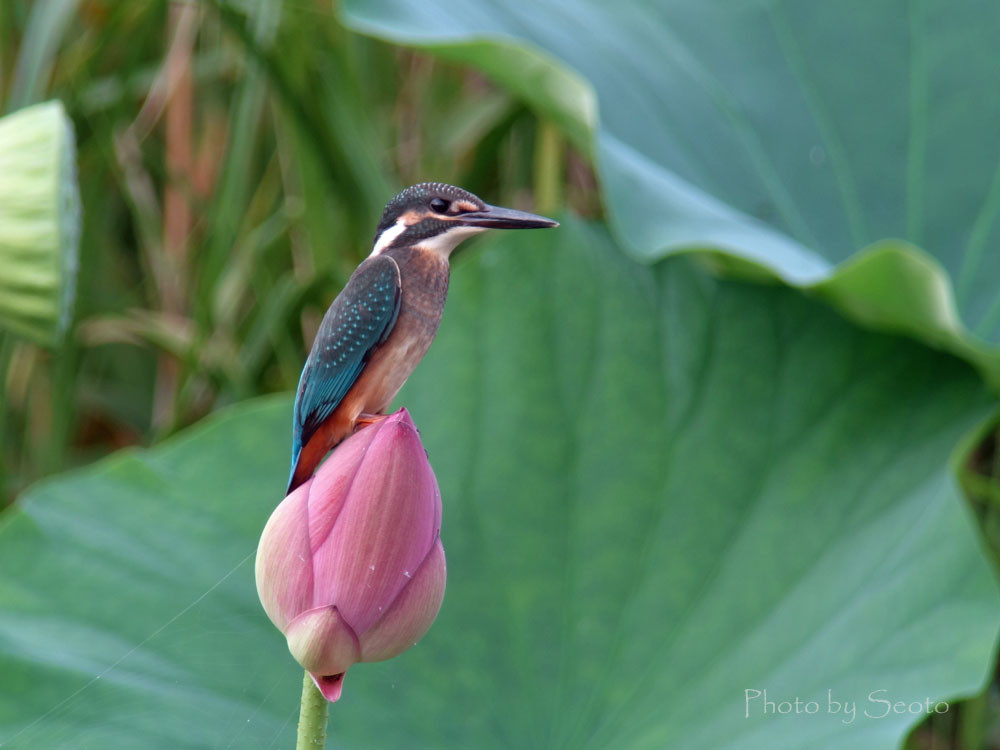 蓮の蕾に留まる若いカワセミ 欲を言えばもうちょっと開いた蕾に成鳥のカワセミが留まってくれたら絵になってよかったのですが…(^-^;