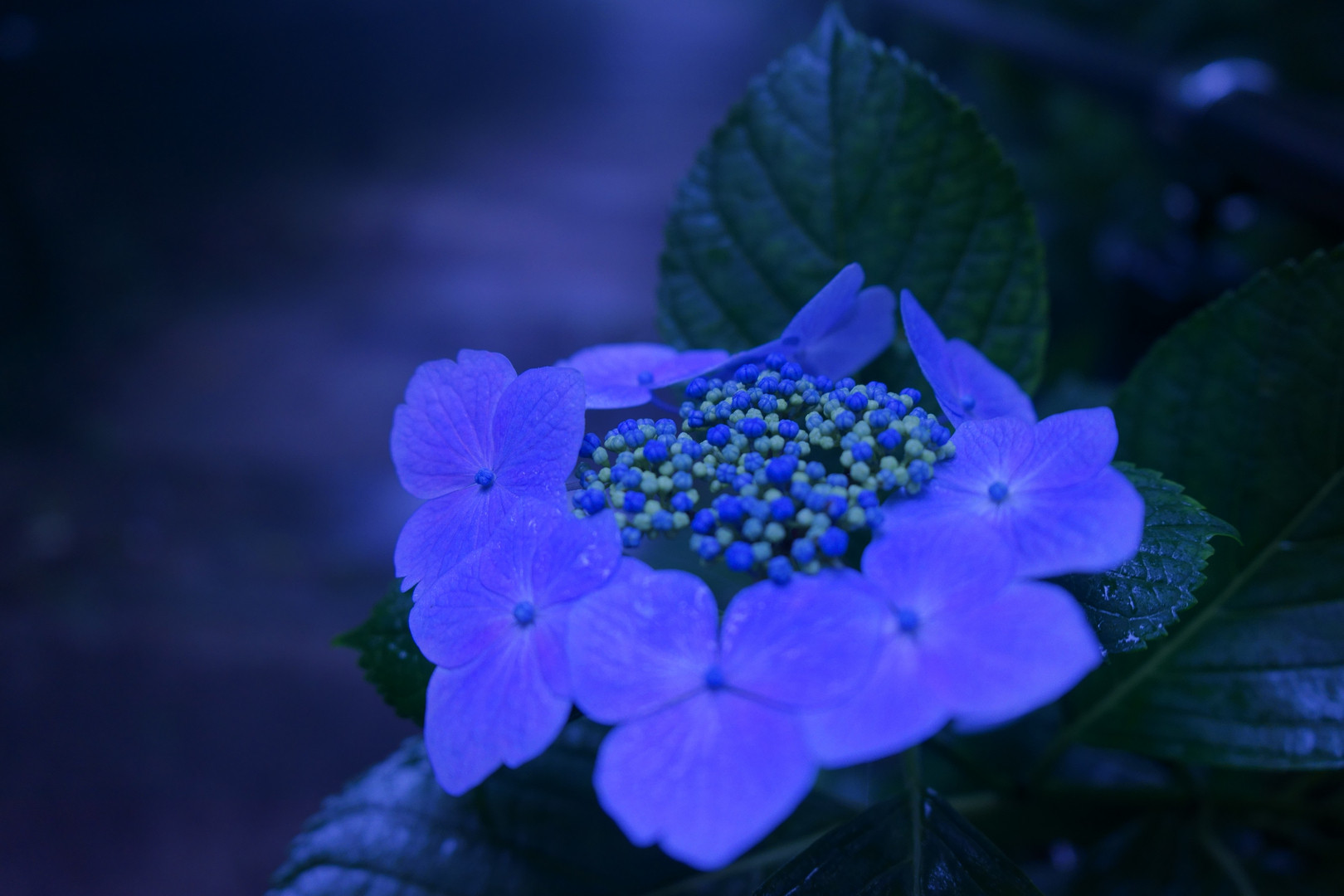 お昼なのに暗い森の中で撮影しました。 その暗さで不安な心を道中のアジサイにほっとさせられた自分の気持ちを表現しました。