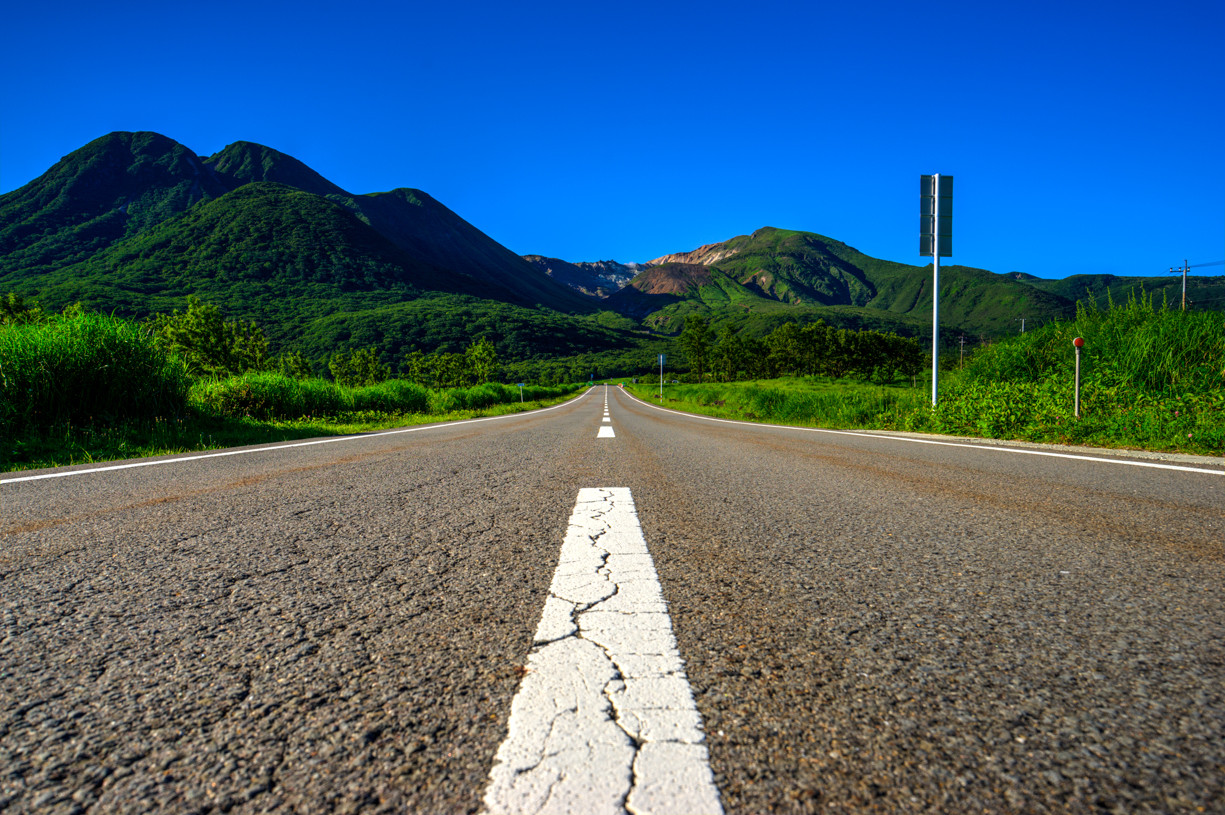 県道11号のど真ん中に寝そべって撮りました。 この時期のやまなみハイウェイは晴れていたら最高に気持ちいいドライブになります。