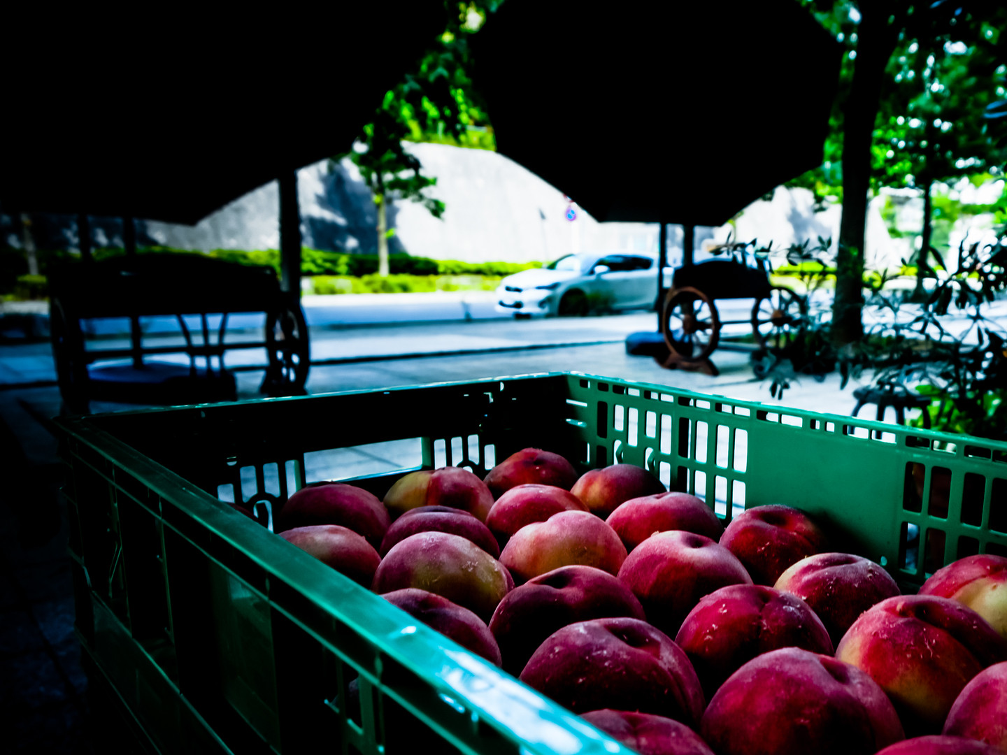 ケーキ屋の軒先。剥かれるのを待つ桃。