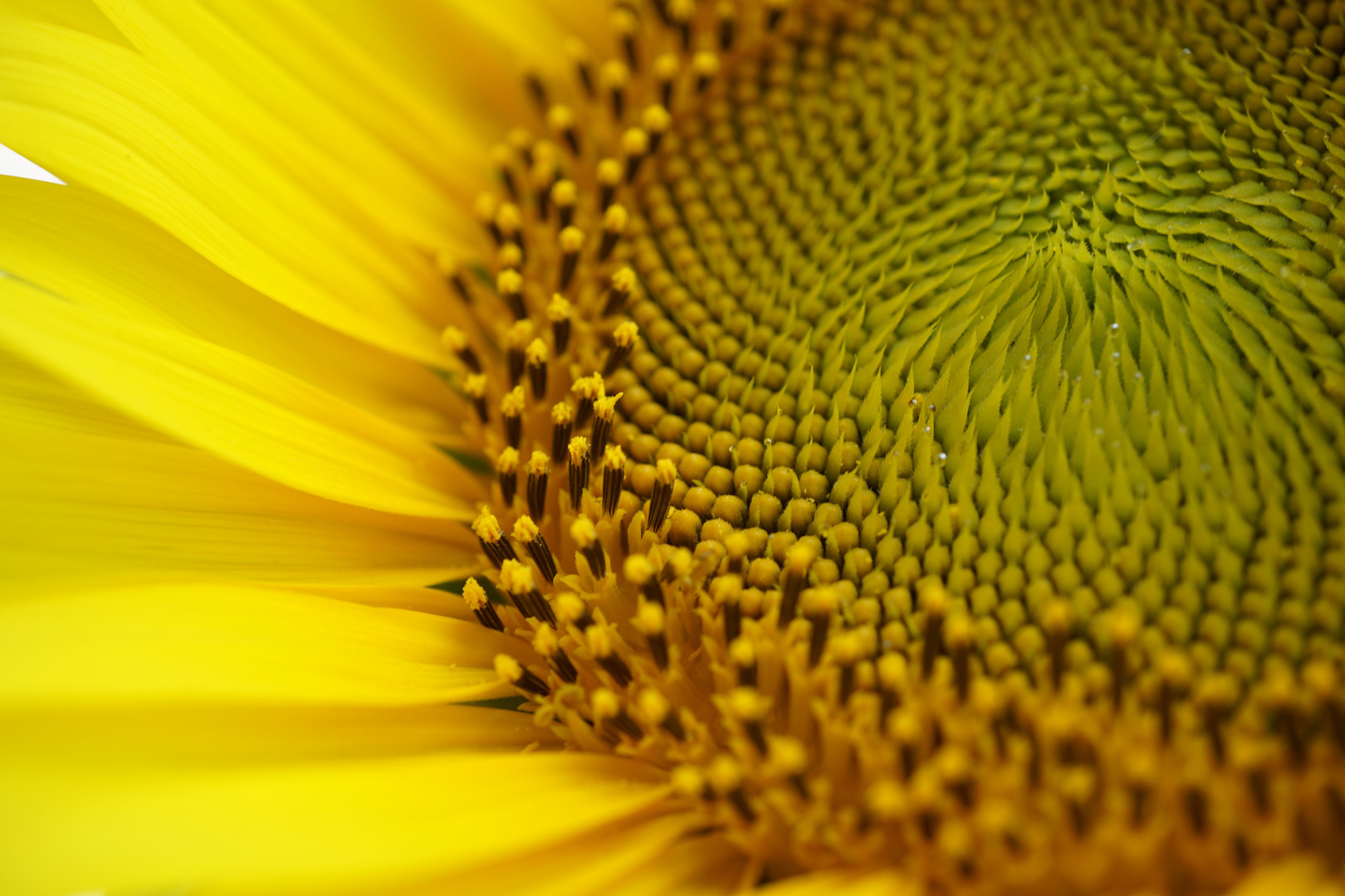 南知多にある 観光農園花ひろば ひまわり畑で。 よく見ると花の中心に小さな水滴が付いていました。 マクロレンズ活躍!