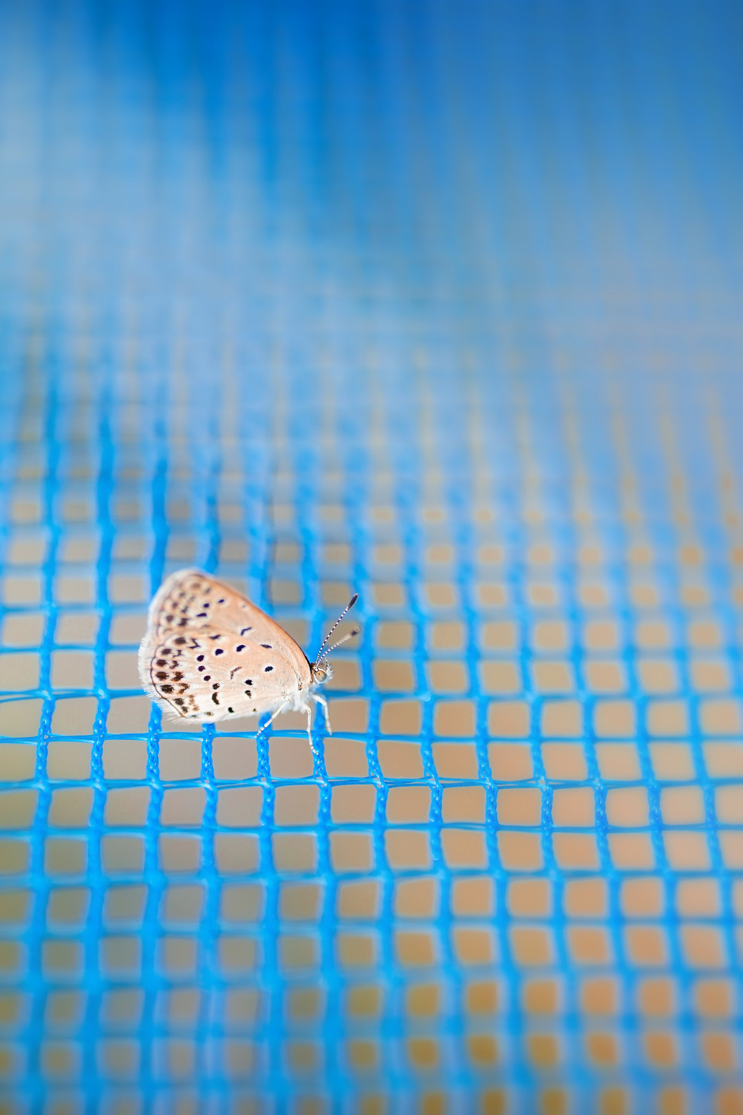 梨畑のメッシュシートに、シジミチョウが... 中に入りたいのかなぁ(^_^.) 小さくて可愛いですね♡
