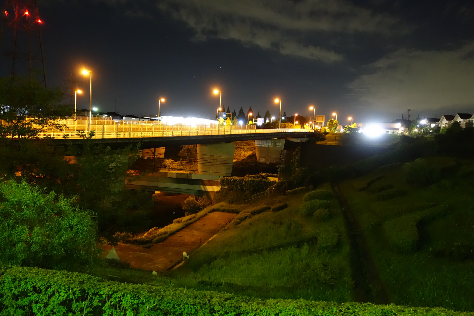 この写真の主役はヤギです。 下半分ぐらいのところに小さく2頭のヤギがいます。 外来植物の駆除をするために、市がココにヤギを放しました。 ですので雑草を食べるのがヤギのお仕事です。 夜だけではなく当然昼も雑草を食べますので 正式には「夜もお仕事」が正しいタイトルですね(^^;