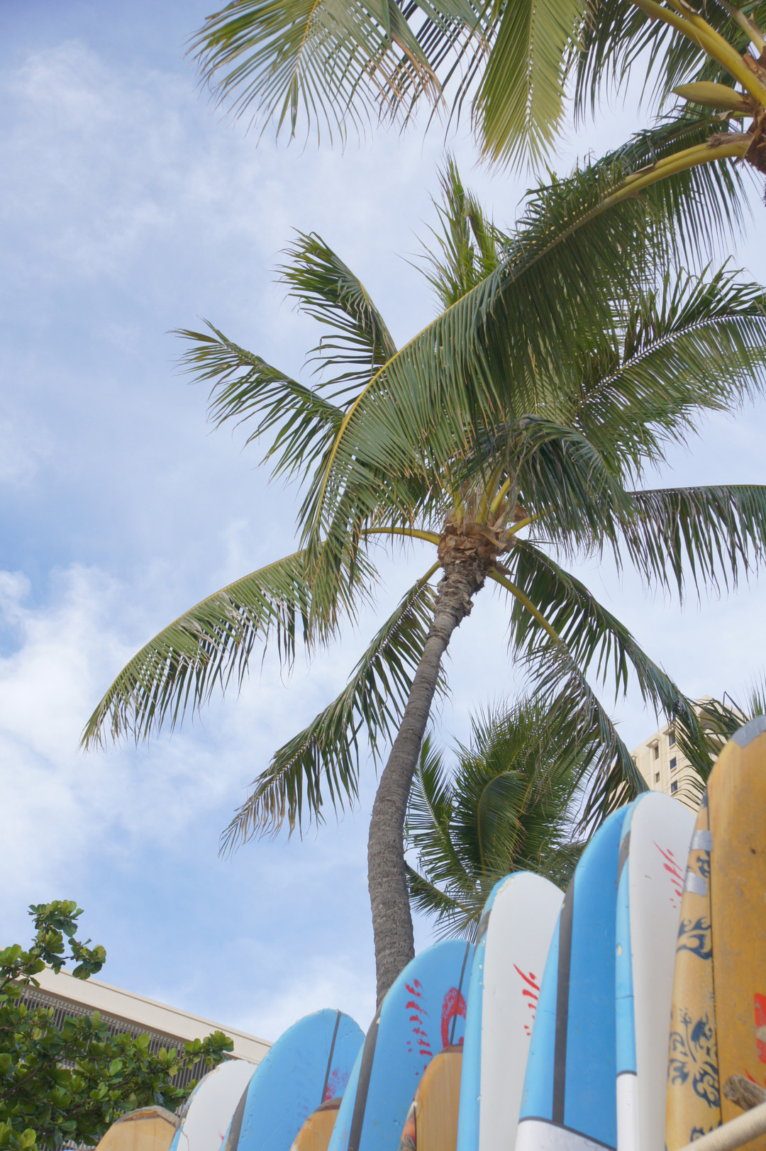 サーフボードの本場、ハワイに来ました。ヤシの木が空に向かい、サーフボードが並んでいました。