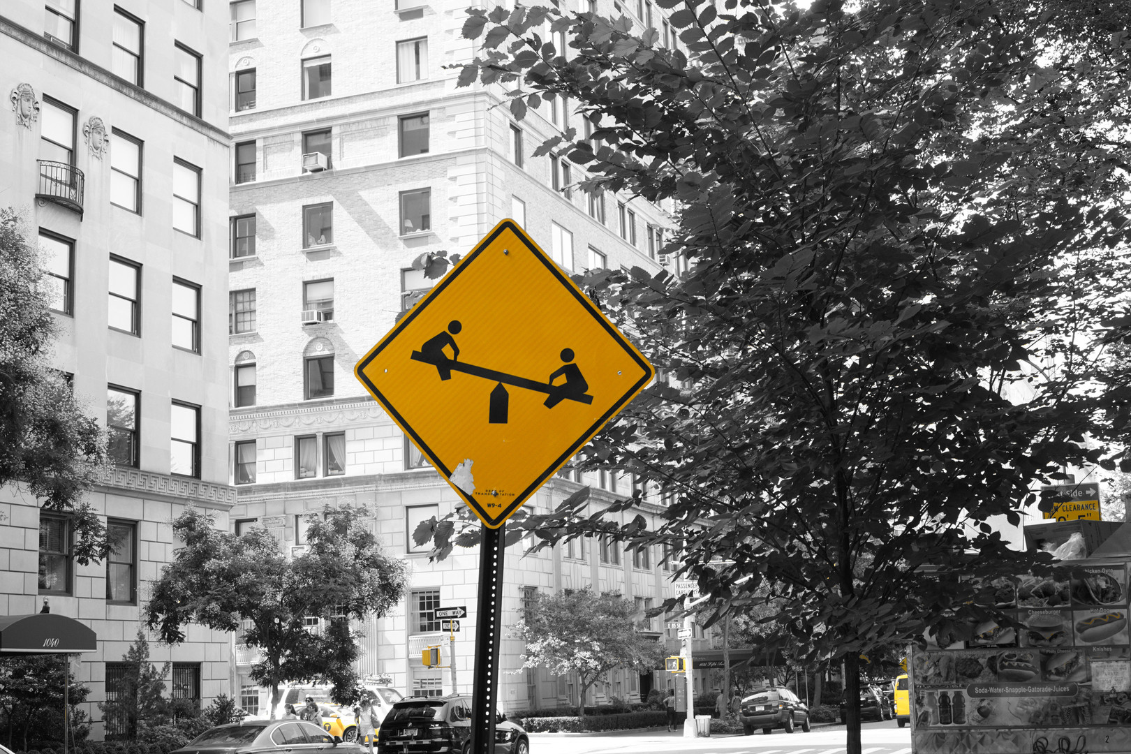 セントラルパーク近くに立っていたなぞの標識。 黄色だけ抽出して目立たせるようにしてみました。