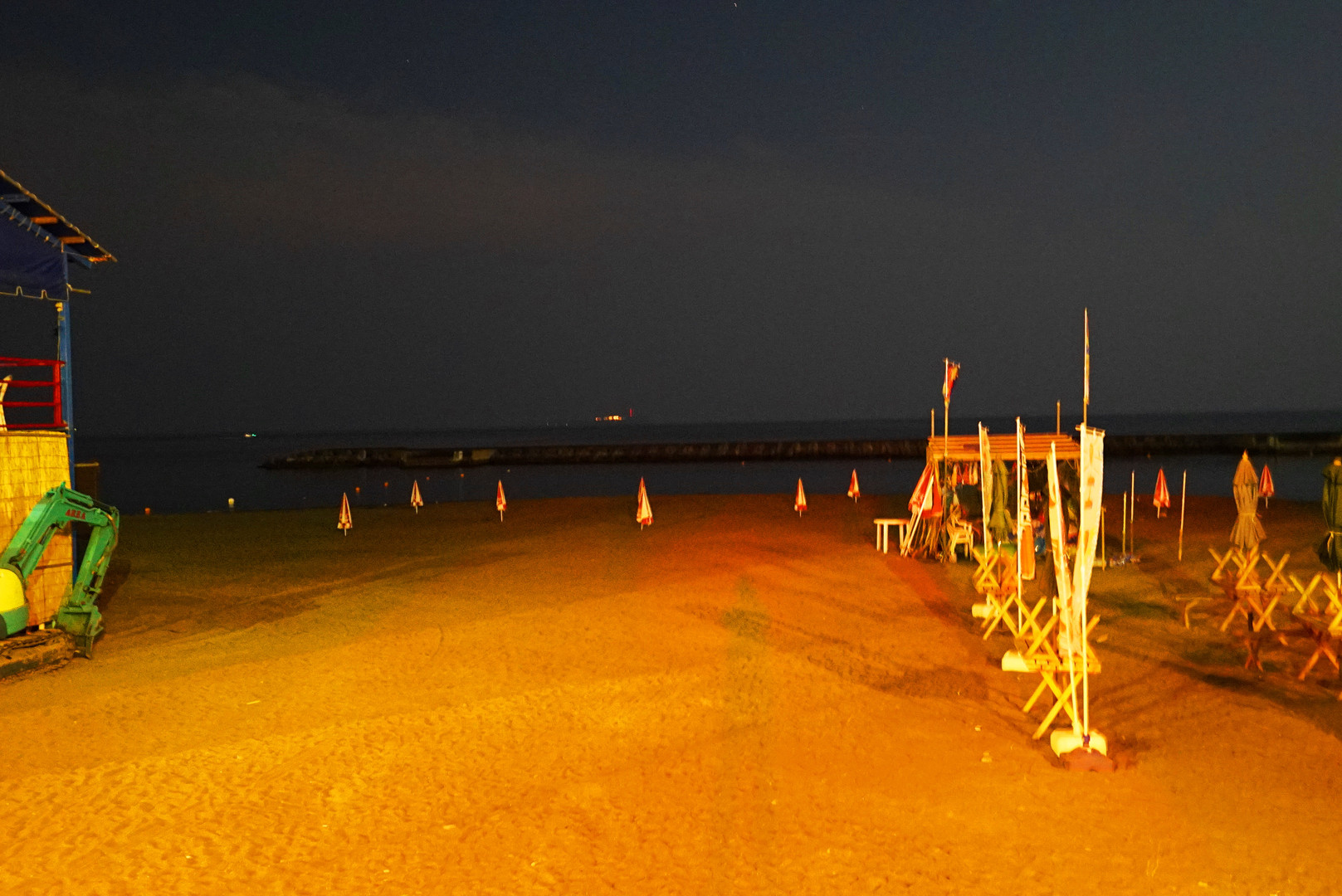 真夜中の海岸は全く違う景色になりますね。 海の家や閉じられたパラソルに哀愁を見ました