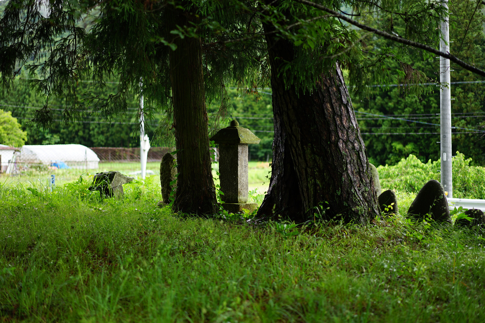 FE55mmを入手して初めて外出してみた際、 田舎の半ば廃墟となっている神社に行き、道路に面して置かれていた 石碑(ではないと思いますが何と表現すればよいものなのでしょうか…)を 裏側から撮影しました。