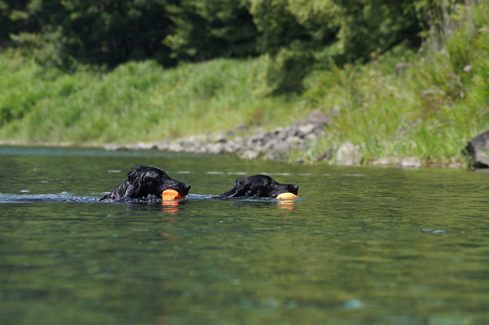 回収したダミーを黙々と泳いで岸に運ぶ2頭