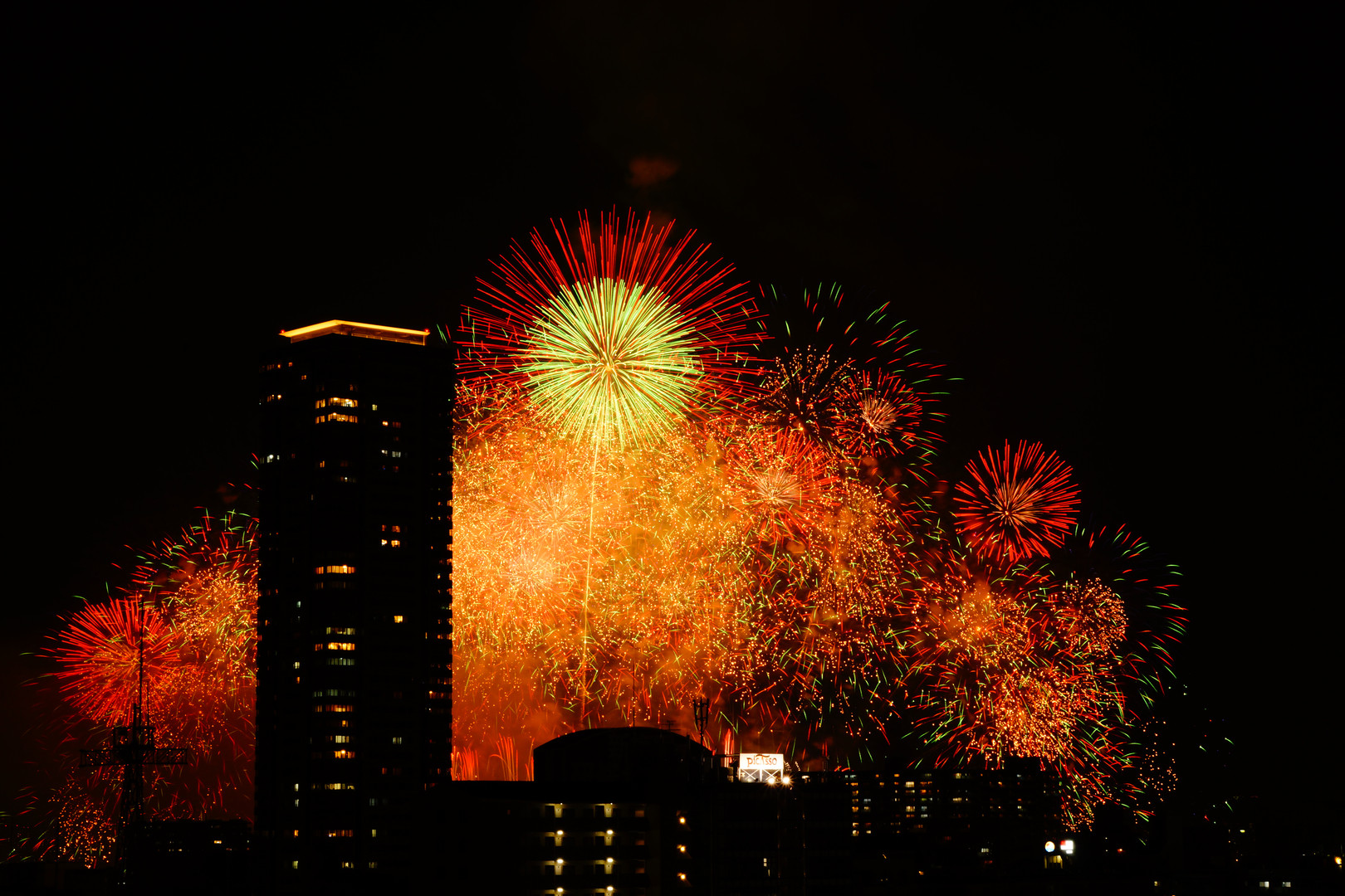 ちょっとリッチに淀川の花火大会が見えるホテルの予約を取って撮影しました。 窓が明けることができて音も聞こえて迫力満点でした。 手前のタワーマンションとかぶってしまったのが残念です。 でも涼しい所で人を気にせず撮影できました。