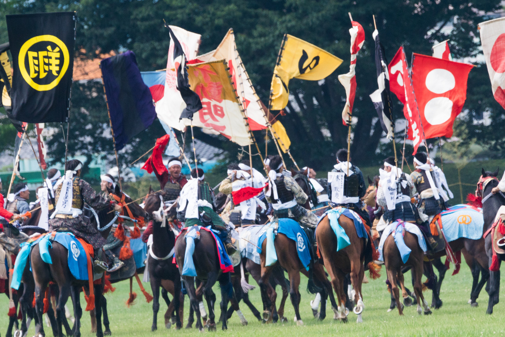 時を超え 戦国絵巻の相馬野馬追い祭りです。騎馬武者たちが打ち上げ花火の中から2本の神旗が舞い落ちてくると、一斉に騎馬武者たちが旗の下へ群がる。