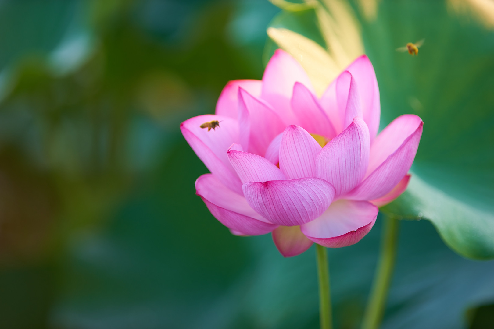 早朝の蓮の花には、沢山の蜂が集まっています。ビビリなので、蜂より蓮中心です(笑) 使用レンズ:アダプター+EF200mm f/2.8