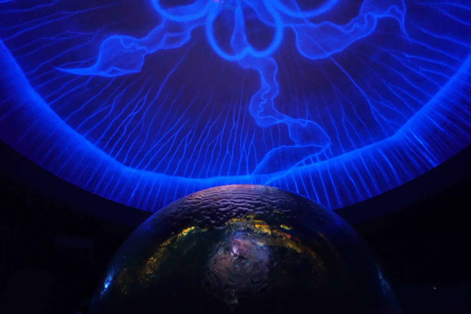 クラゲの入ったガラスの球体水槽とクラゲの照明が綺麗でした。
