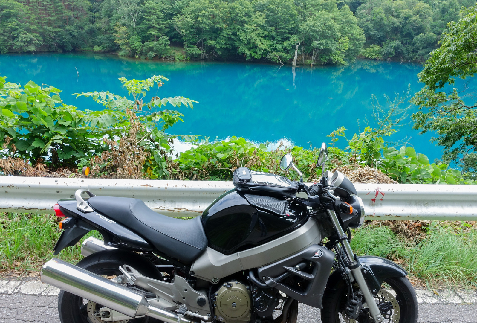 夏休みにあてもなくバイクで走っていたら、ものすごい色の湖をみつけました。