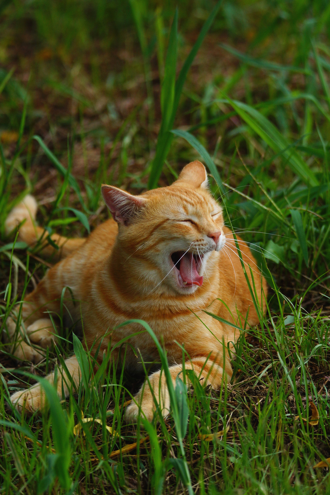 草むらでリラックスするキンちゃん(金色っぽいので、キンちゃんです)。 この子は毛並もきれいなので飼い猫と思われます。 そっくりの息子らしき茶トラくんもたまに見かけます。