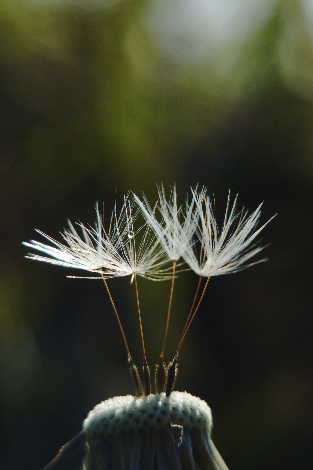 11月下旬、朝露の残る野原でたんぽぽの写真を撮っていると、その中の一本に朝露が一滴残っているのを見つけた。