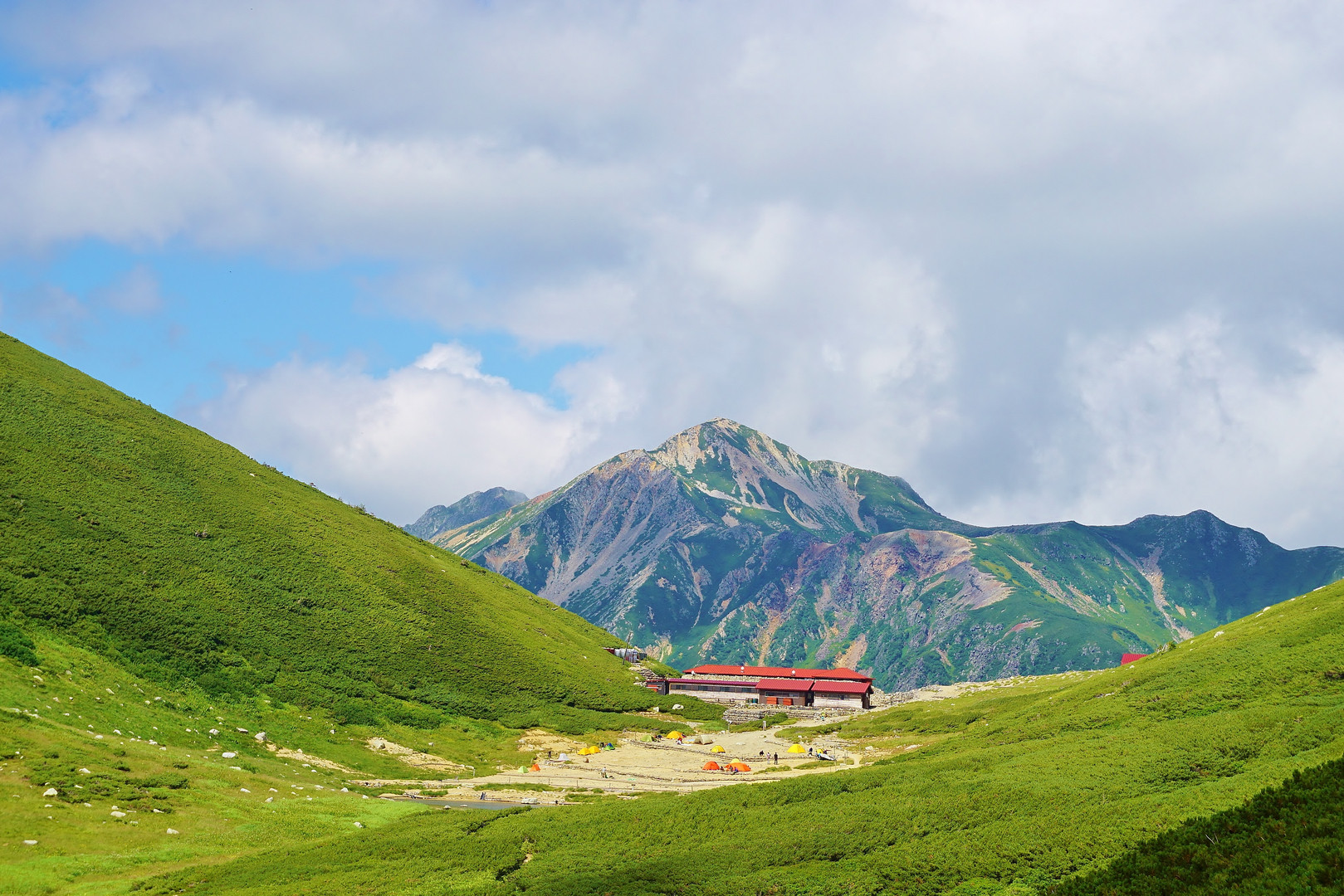 登山口から7時間歩いて、たどり着ける場所にある山荘です。山荘の手前にはテント場と小さな池があります。美しい山々、色とりどりのテント、自然のお花畑、それらを眺めながら飲むビール(笑)・・幸せなひとときです(*^_^*)