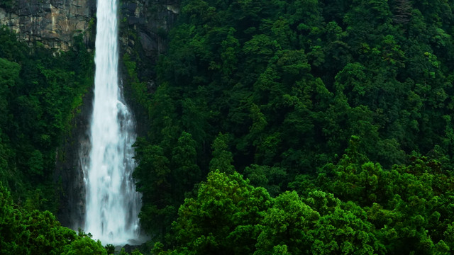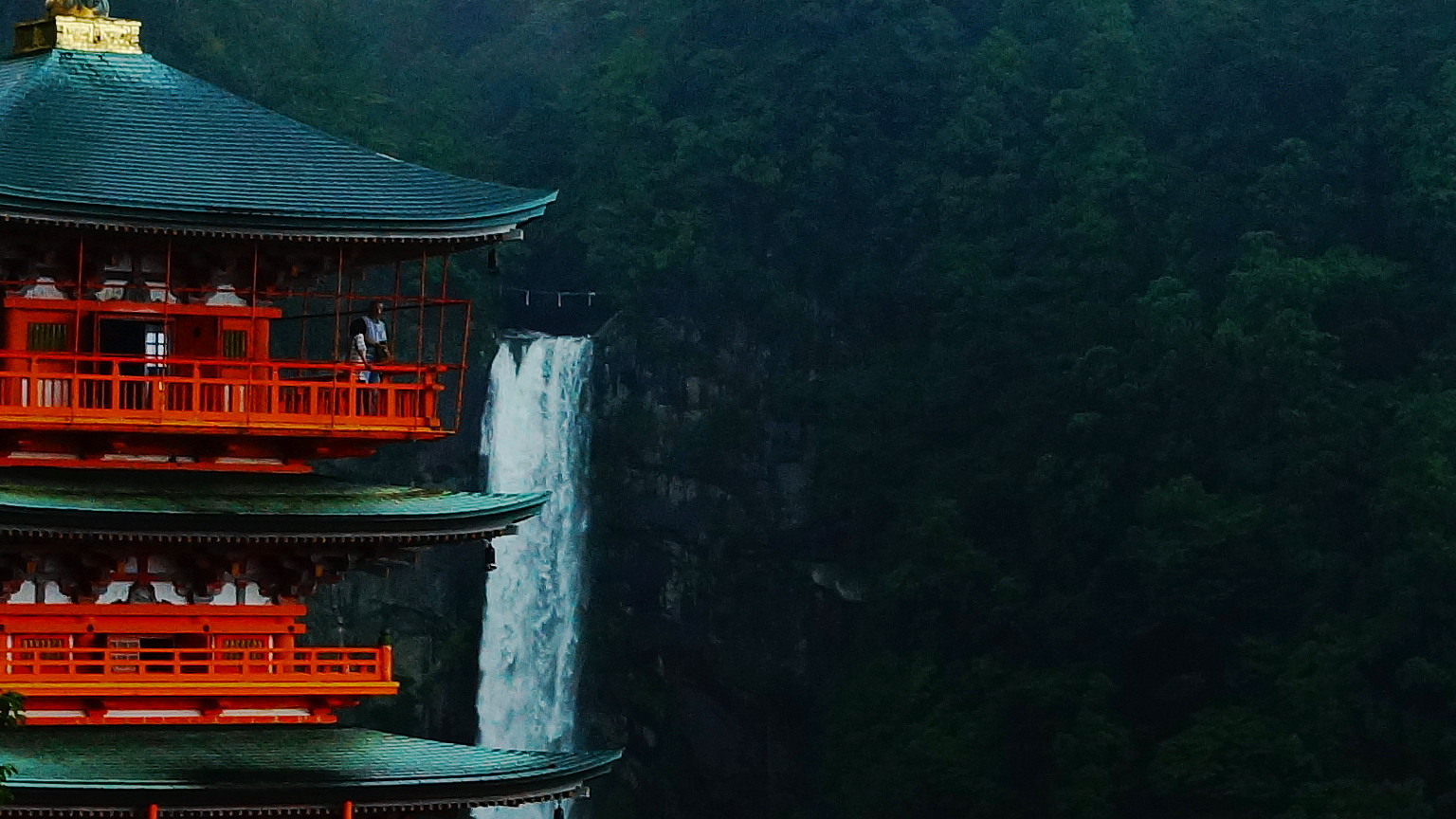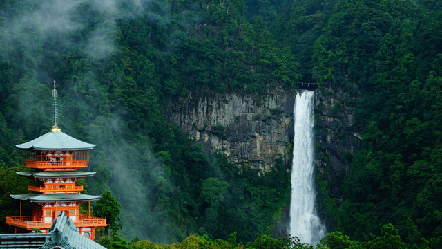 落差133mの那智の滝と青岸渡寺の三重の塔のある風景。
