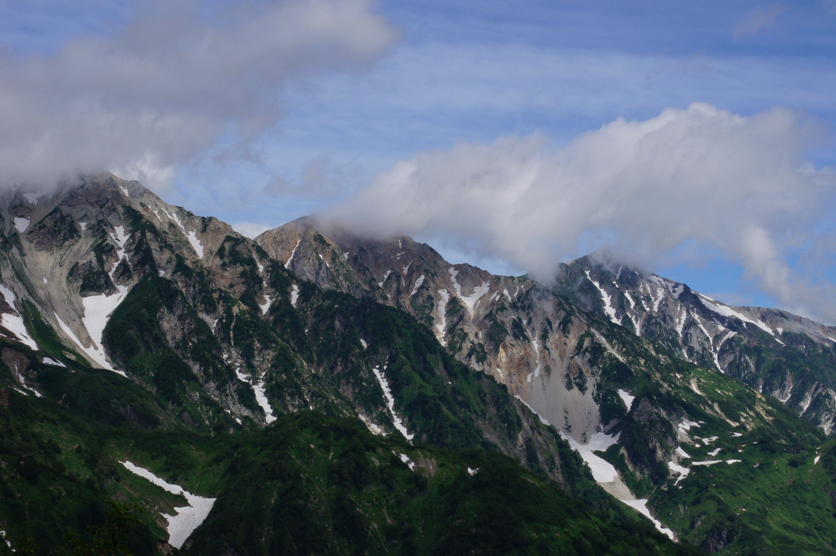 八方尾根からの展望です。なかなか雲がどかずにしばらく眺めてやっと撮りました。 あとで聞いたら、3つの峰はなかなか顔を出さないそうです。