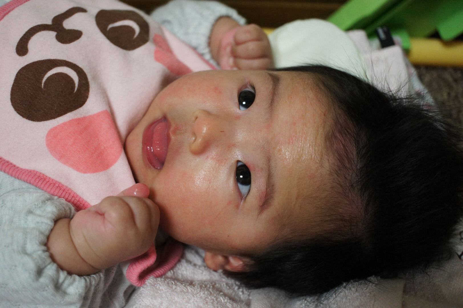 現在4歳の次女の生後3か月当時の写真です。 ずーっとNEX5を構えてて、たまたまこの表情になったところでシャッター切りました。今はもうじっとしてないので、先日α6000買い、これからバシバシ撮っていく予定です。
