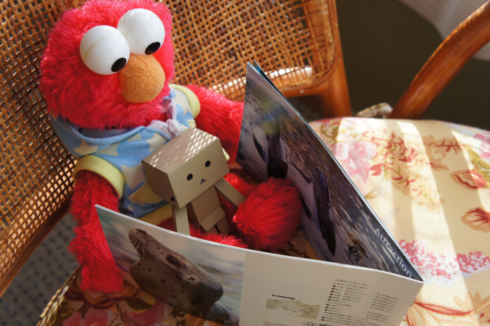 我が家のメインキャラクターのエルモとその仲間達が旅をした写真 朝早く起きて旅館でくつろぎながら今日一日の予定を思案中の二人。 ダンボー「ねぇエルモ今日はどこに行く?」 エルモ「アシカさんとイルカさんのショータイムなんてどうかな?」