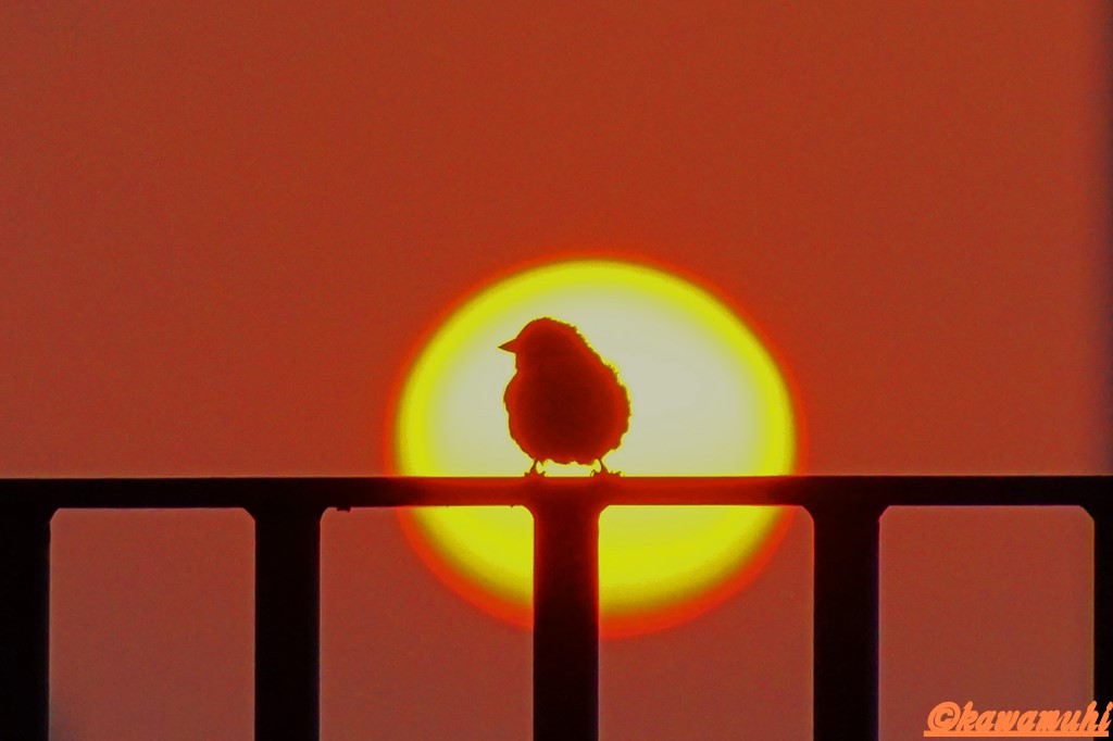 夕陽を背にしてたたずむスズメ。神々しいのか?それとも焼き鳥・・・・・・(^-^;