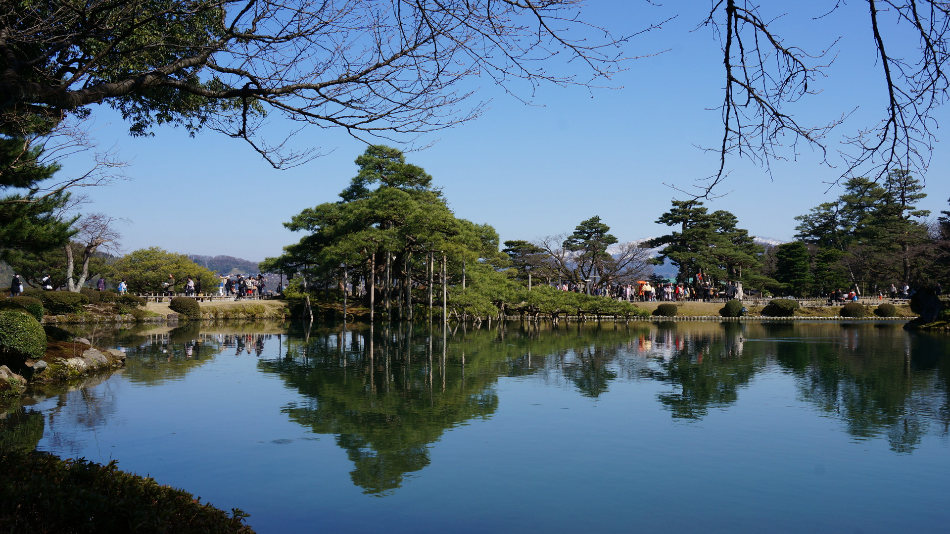 3月の穏やかな日に旅した兼六園(霞ケ池)の逆さ松を狙って。