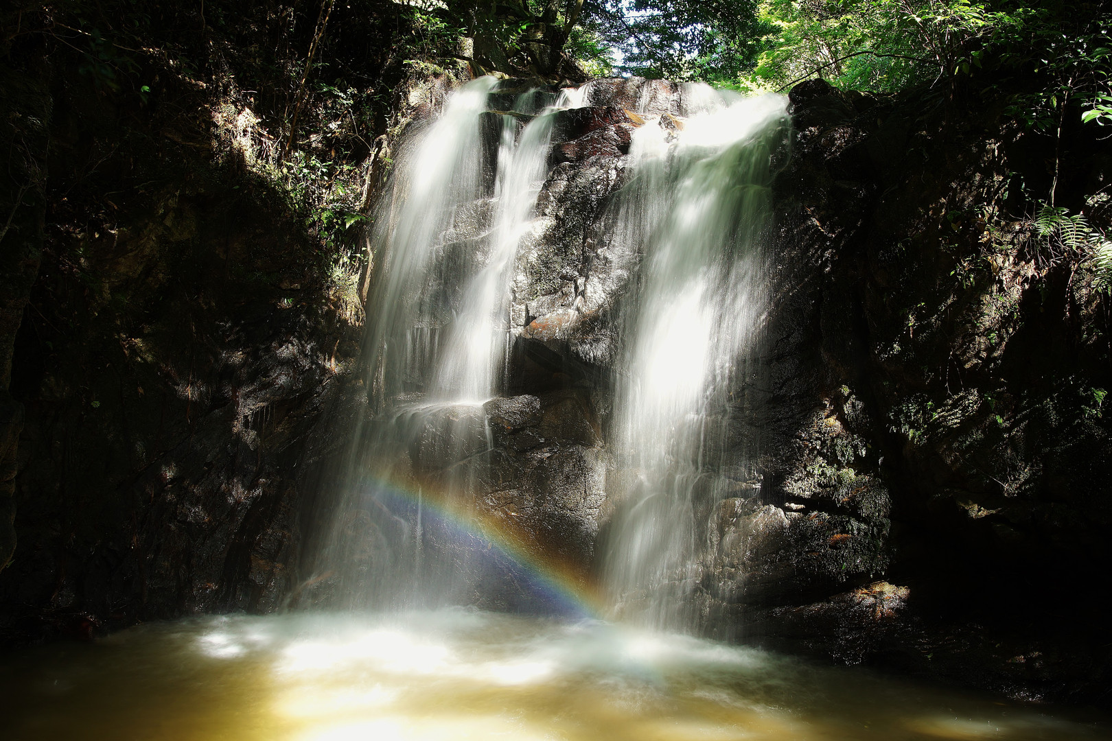 福岡県粕屋郡宇美町 ☆県民の森☆ にある滝です。 晴れたり曇ったりの天気でしたので、明るくなったり暗くなったり… 虹も出たり出なかったり…適当にシャッター切ってたらうまい具合に撮れました。