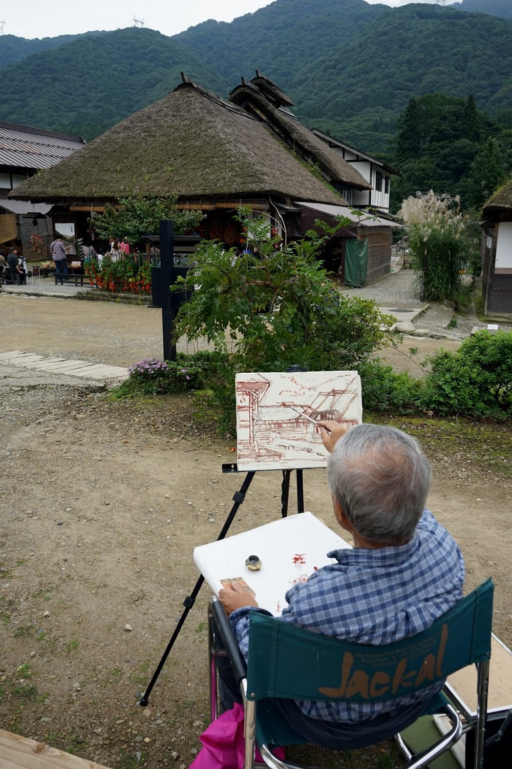 小雨模様の日曜日。福島県会津地方の大内宿で撮りました。ここは写真を撮る人は多いのですが、絵を描いている方は珍しいです。