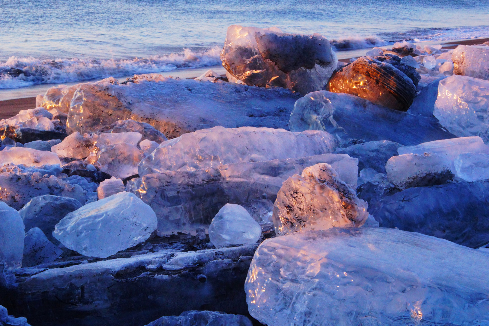 海岸に打ち上げられた氷塊に朝陽が当たり、赤く輝いていました。朝陽の当らない氷塊は青く輝き、赤色と青色に染まる氷塊の情景を撮りました。