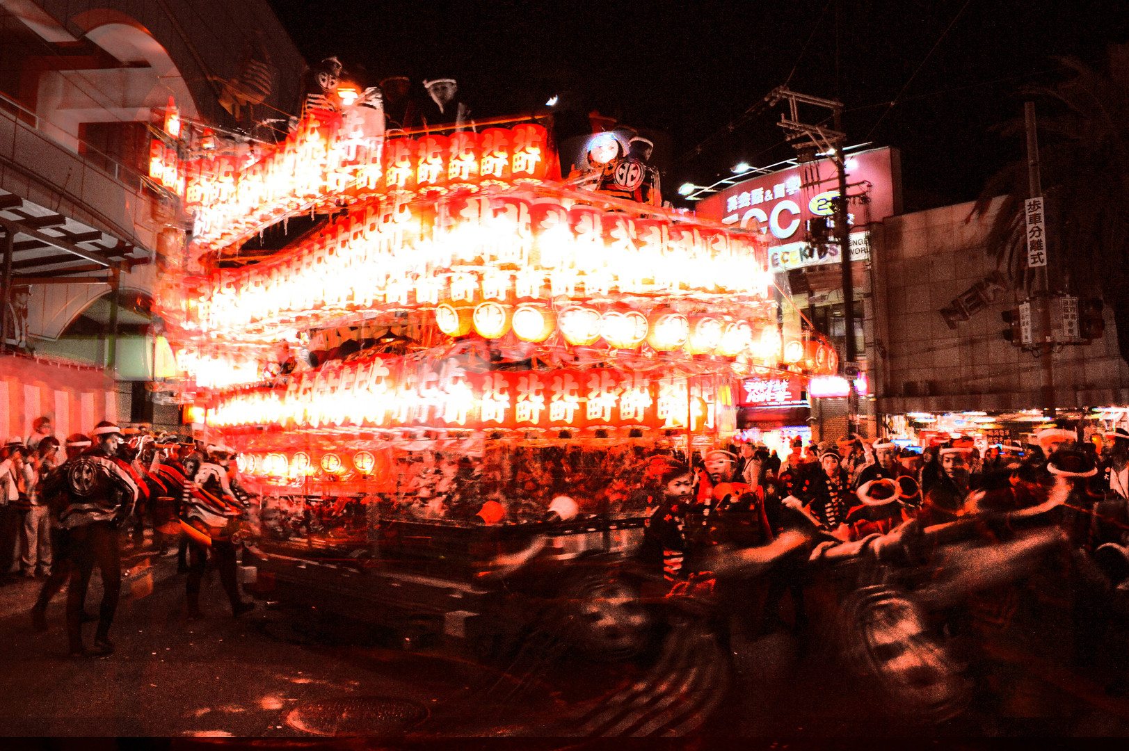 宵宮の灯入れ曵行時の「やりまわし」風景(レイヤー3枚多重合成)
