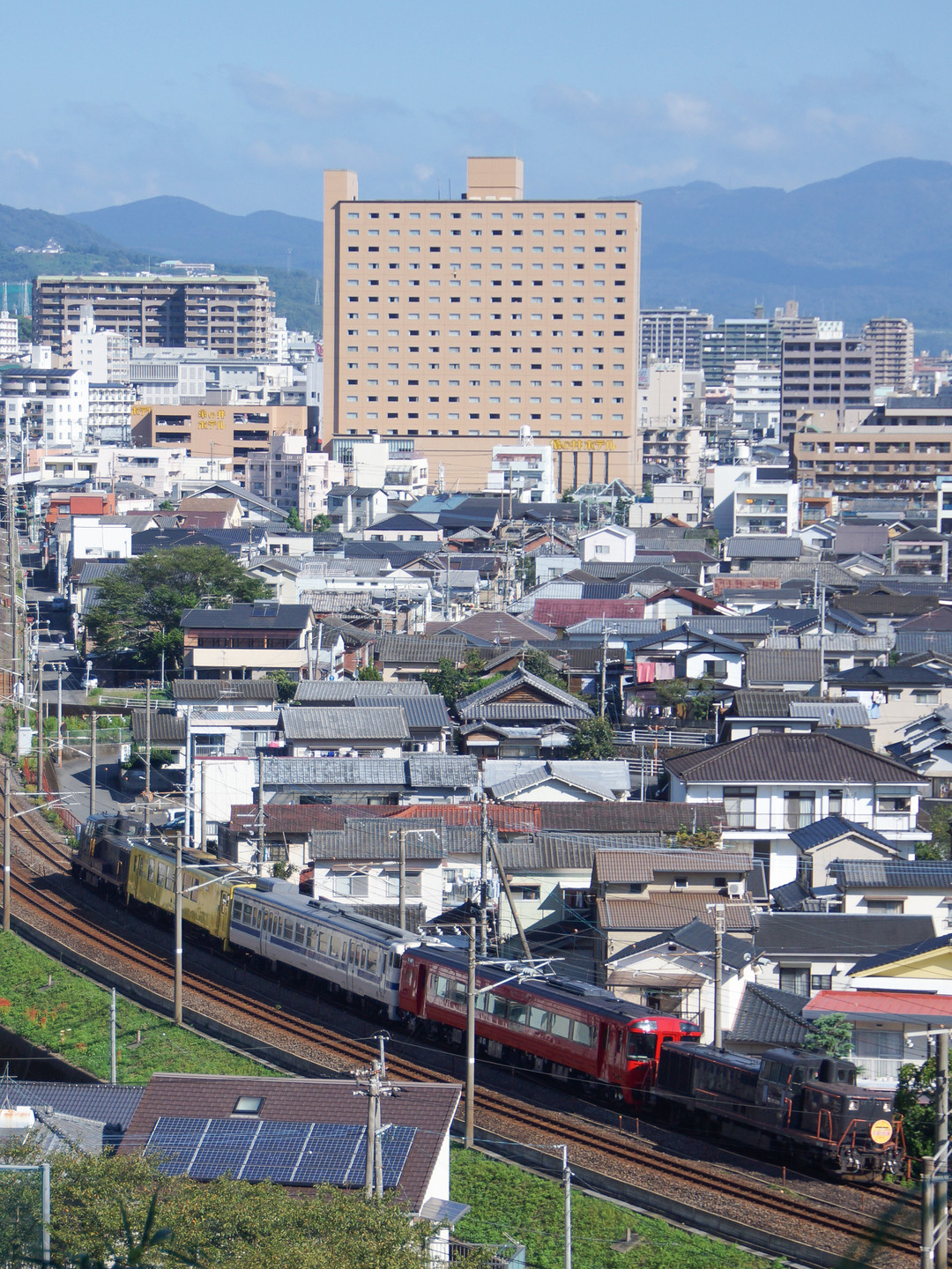 JR九州大分車両センターの一般開放「トレインフェスタin大分」、その会場への 運行のために特別編成された、寄せ集め列車。 DE10+キハ125+キハ147+キハ185+DE10の5両編成