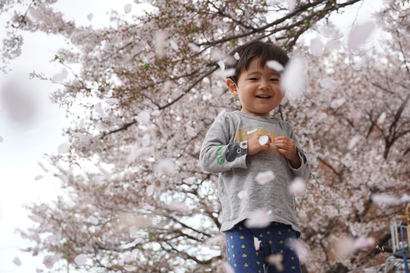 桜の散り際に公園で撮影しました。 子供は花びらを集めては空に放り投げるという遊びが気に入ったようで、飽きもせず遊んでいました。