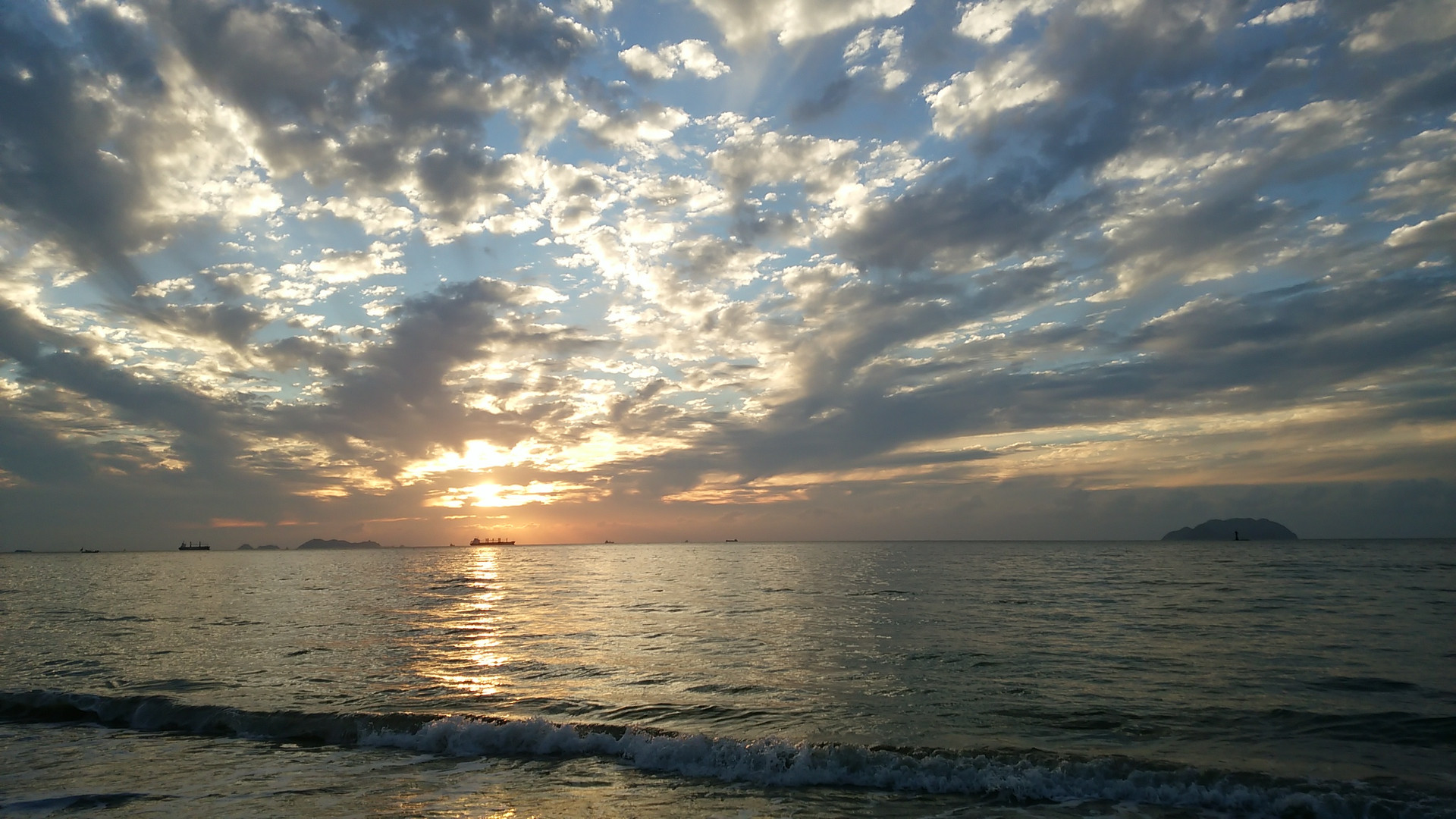 関門海峡を通過するために沖待ちする船に秋空と夕暮れが迫っています