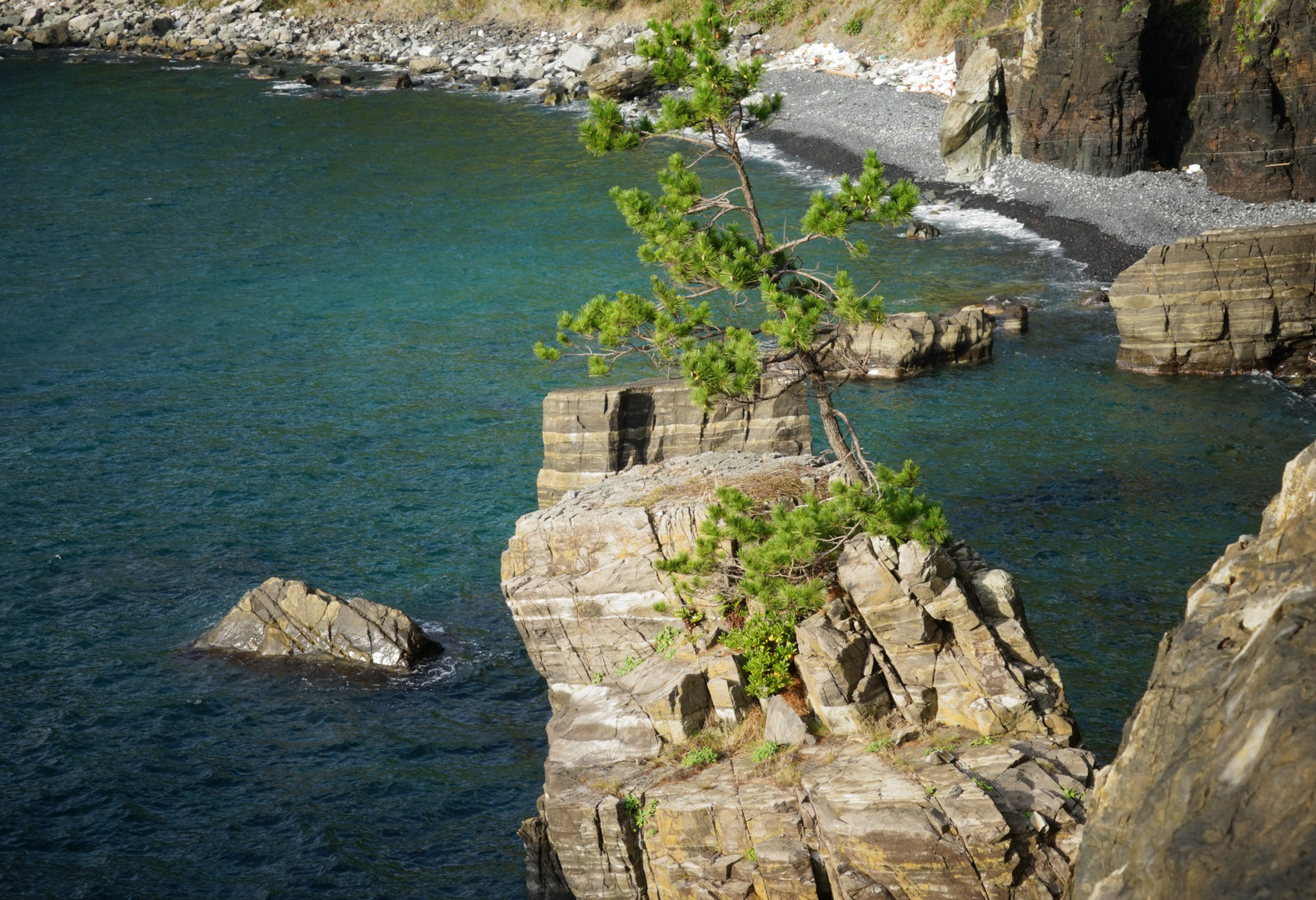 ホルンフェルスの岩の上にがんばって生き抜く松