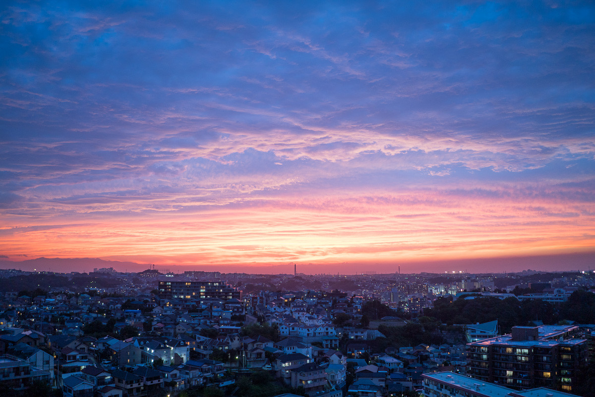 薄い雲が重なり合って、空が普段の夕焼けより穏やかな色合いになっていました。