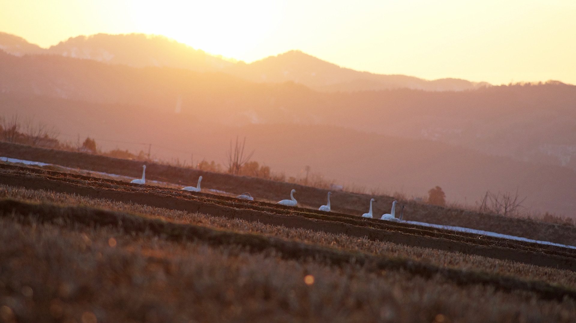 日本の冬が終わり北方へ帰る前に、圃場で農家の方が刈り残したお米を食べに来た白鳥の群れです。一定距離から近づこうとすると群れごと移動してしまうので、これがギリギリ撮影可能な距離でした。雪解けの頃の夕日を浴び朱色に染まる白鳥を近くで撮りたかったのですが、まだ打ち解けてはいないようで遠距離からの撮影となりました。
