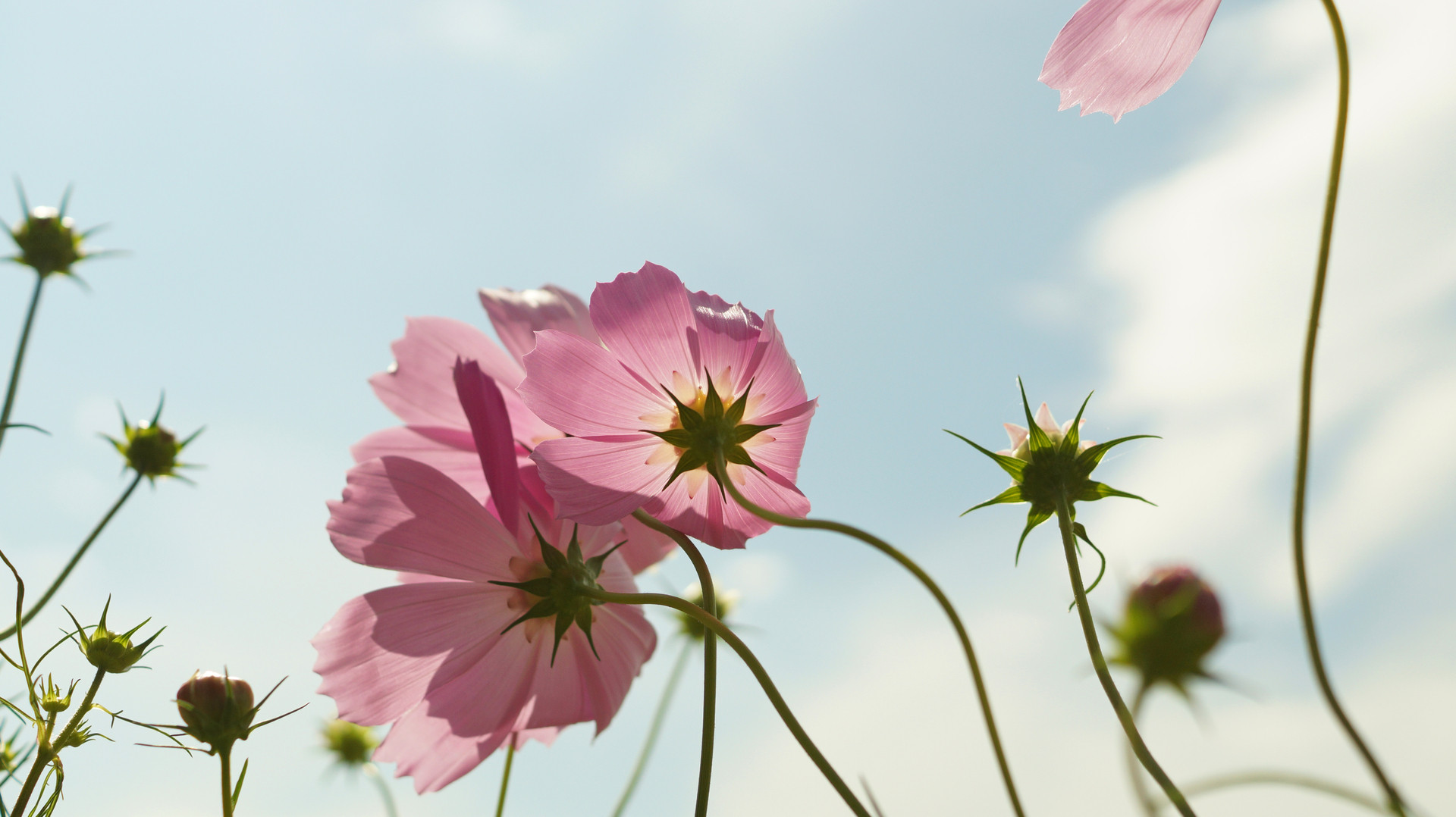 圃場の道端に咲いていた秋桜を陽光に向かって撮影しました。風に吹かれて揺れているところ、身を寄せ合うような瞬間をアップしました。本当はもう少し秋の雲の流れる様子を入れ込みたいですが、自分の技術の成長が必要なようです。