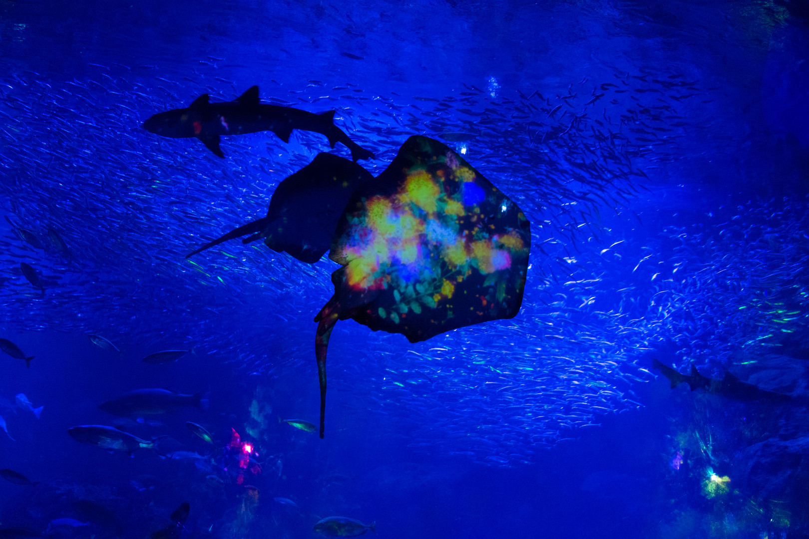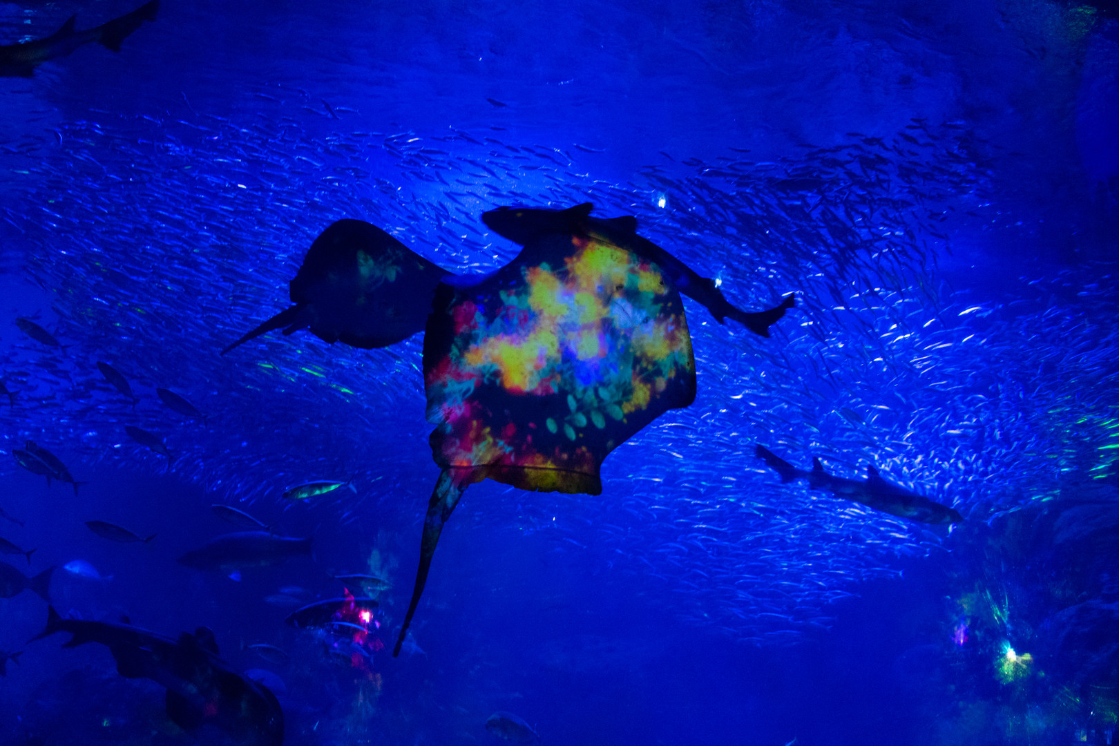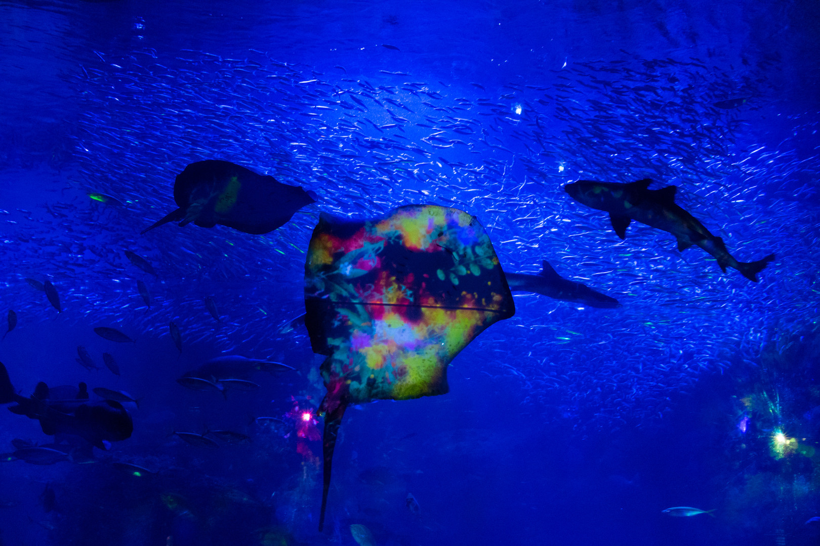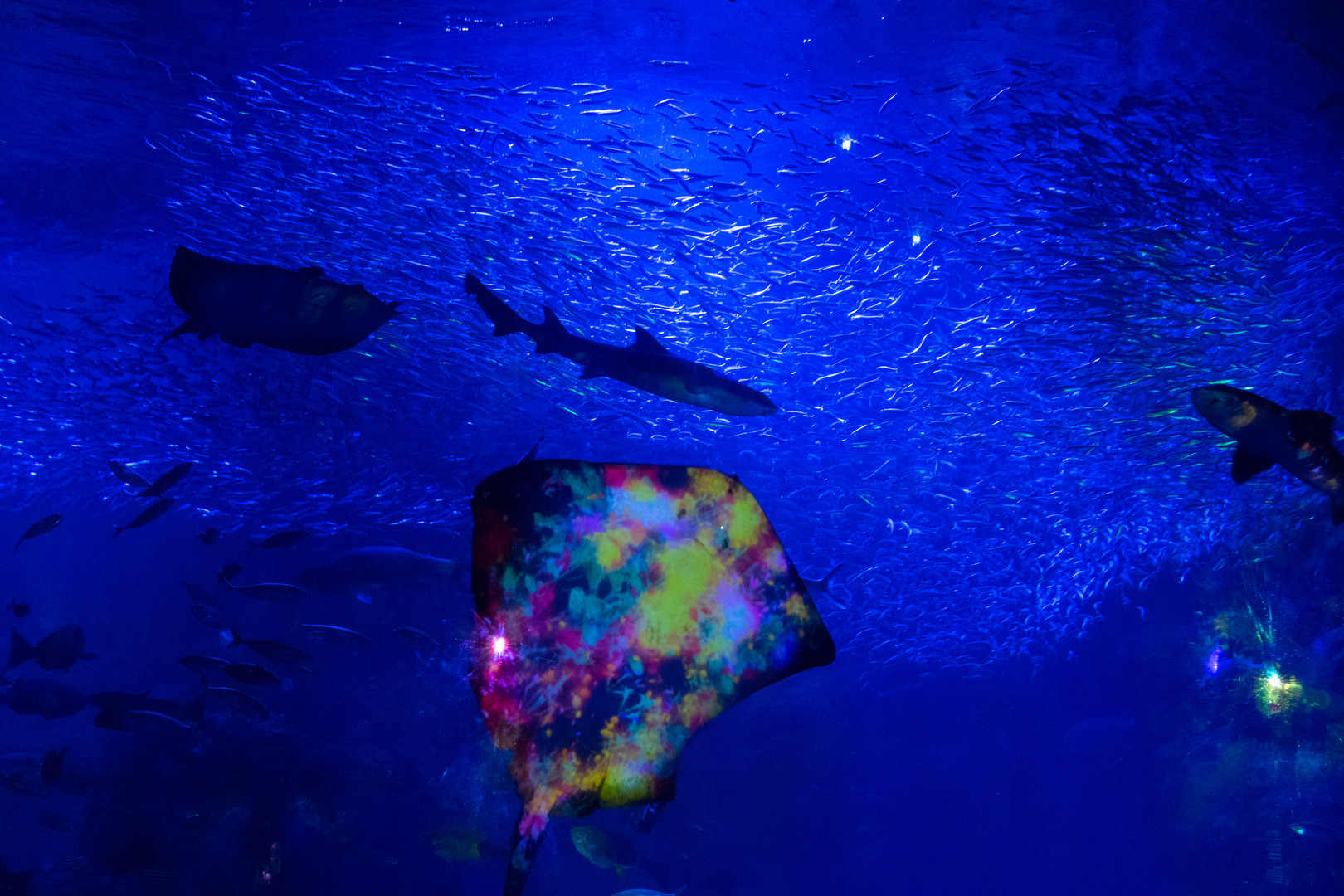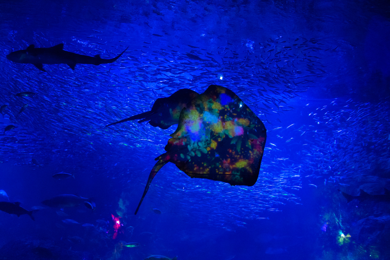 エイ(で良いのかな?)のお腹がやたらカラフルですが、これはプロジェクターで花の映像を映し出しているからです。