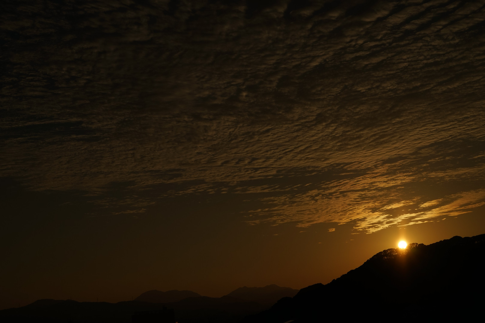 この日は朝から晴れやかで16時過ぎても青空いっぱいでした。 綺麗な夕焼け空を期待してカメラ持って出かけました。 残念ながら西の空が真っ赤に染まることはありませんでした。 で、夕陽が沈む瞬間だけ撮って帰りました。