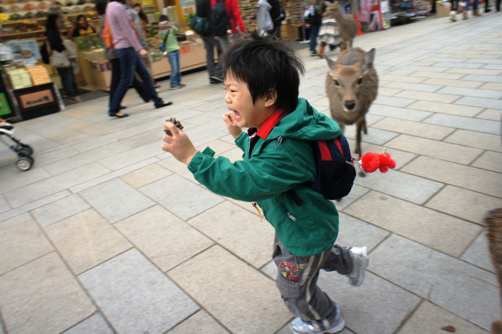 初めての奈良。シカの目線は子供と同じ高さ。こわいよねえ。