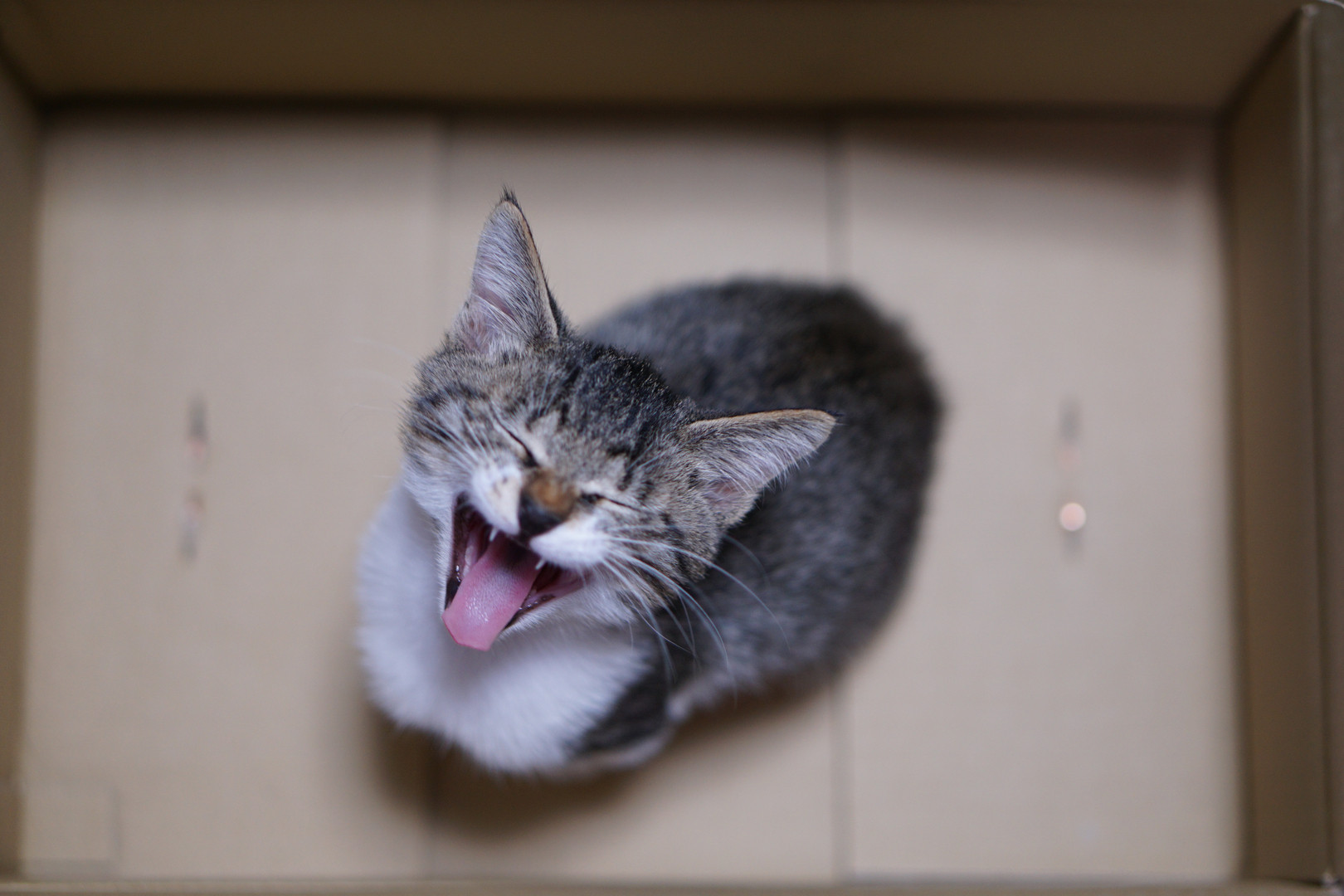 ダンボール箱をおいておいたら、自主的にIN。捨て猫ごっこに興じる仔ニャンです。もう、おうちに来ているよ~。