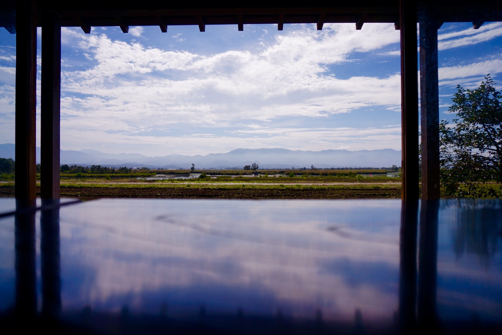水面ではなく、テーブルに反射した秋空が綺麗でした。