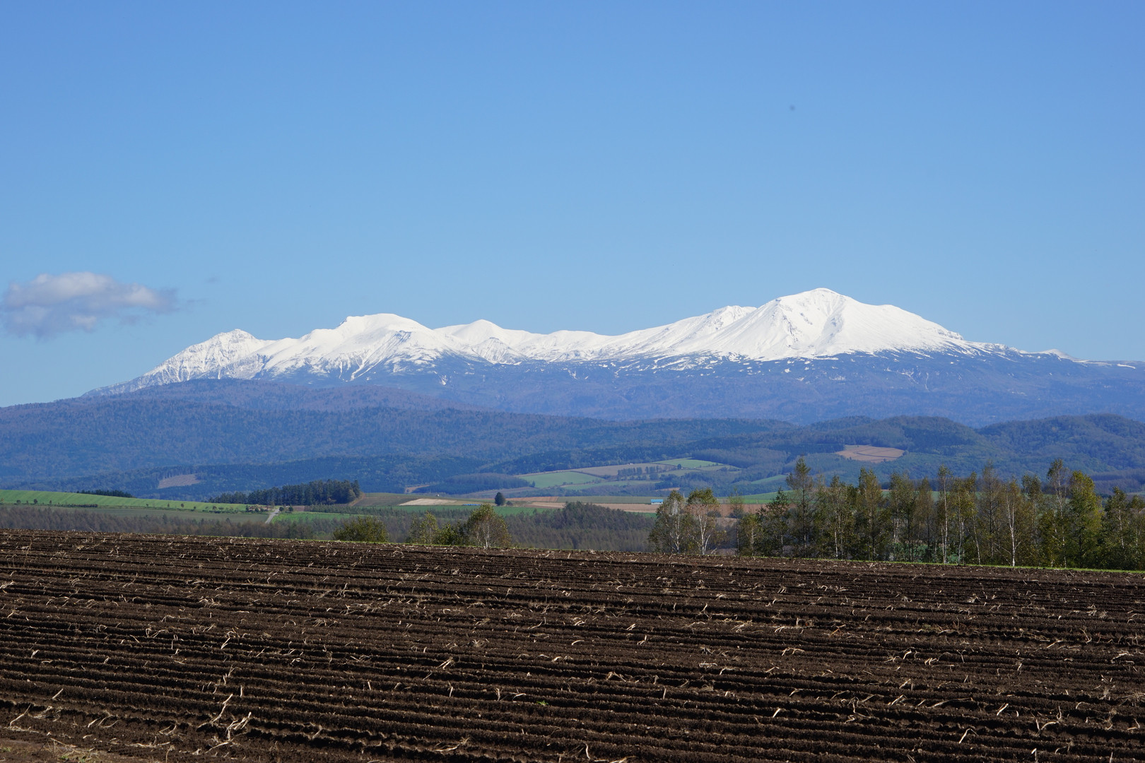 雪帽子をかぶった大雪山、一月もすると里も雪景色。