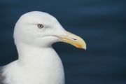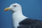 目力が印象的な鳥。 空、海の青いバックとともに。