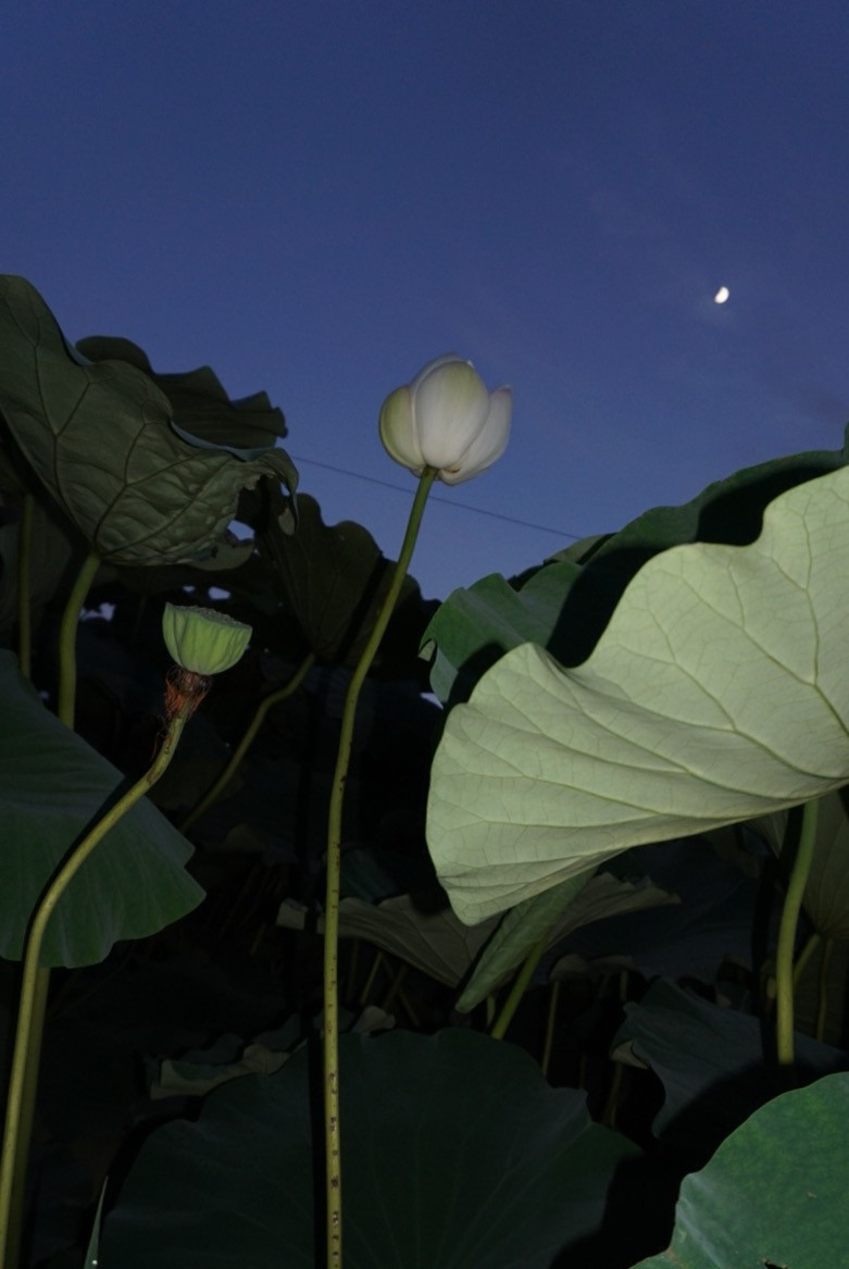 夕暮れ時の蓮畑…月が小ちゃく星のよう😆